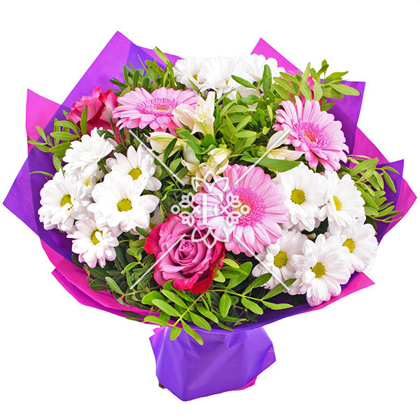 гербера розовая - 1 шт., роза розовая -1 шт., альстромерия белая - 1шт., хризантема белая (ромашковая)- 3 шт., зелень,лента.